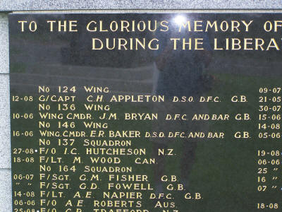 'To the Glorious Memory of the 151 Typhoon Pilots Who Gave Their Lives During the Liberation of Normandy May - August 1944'. The name of Wing Commander E R Baker DSO, DFC and Bar appears third down on the left.